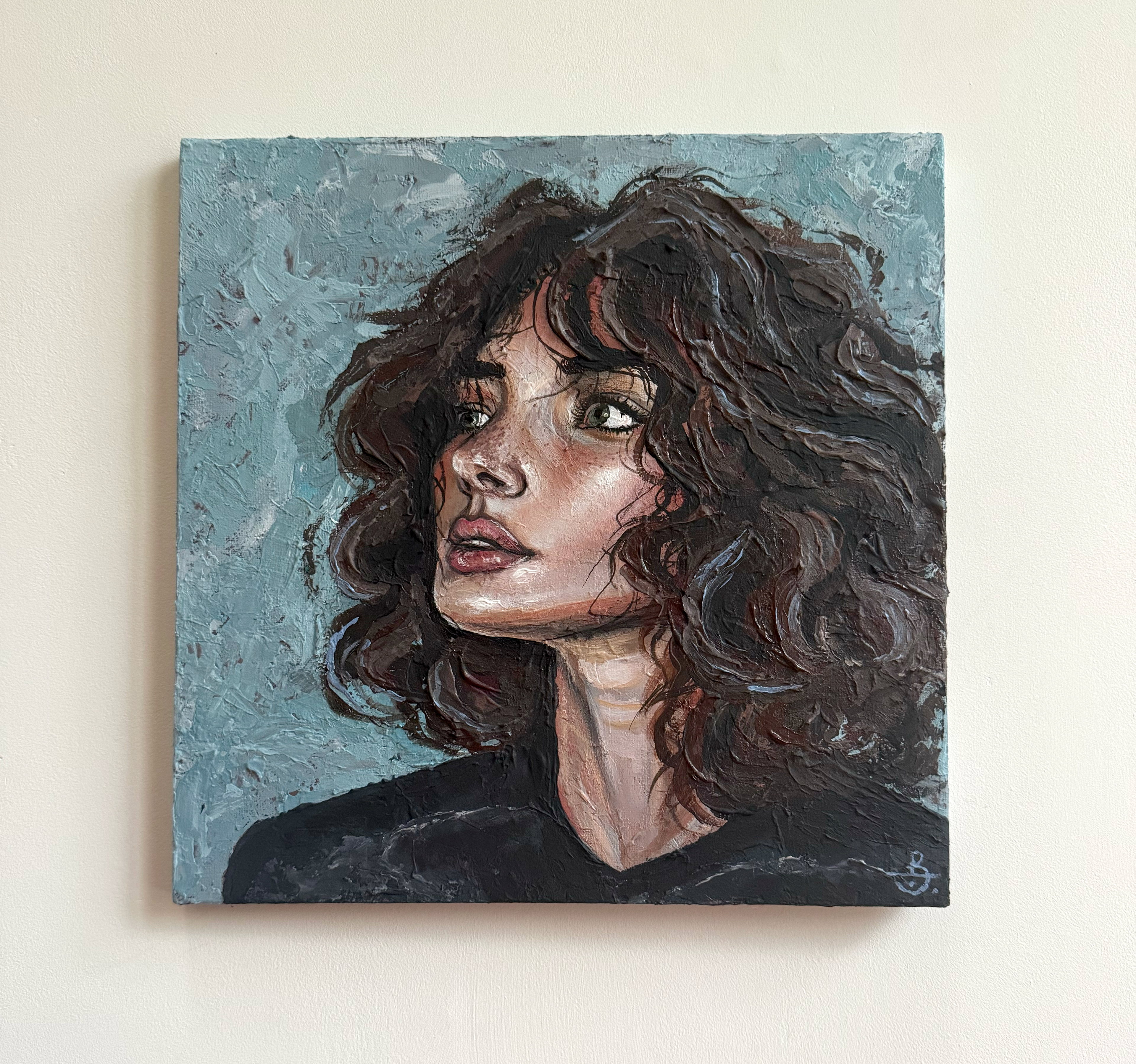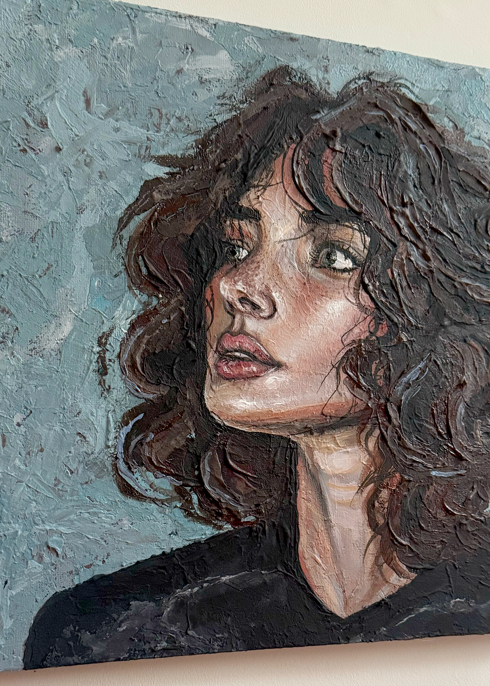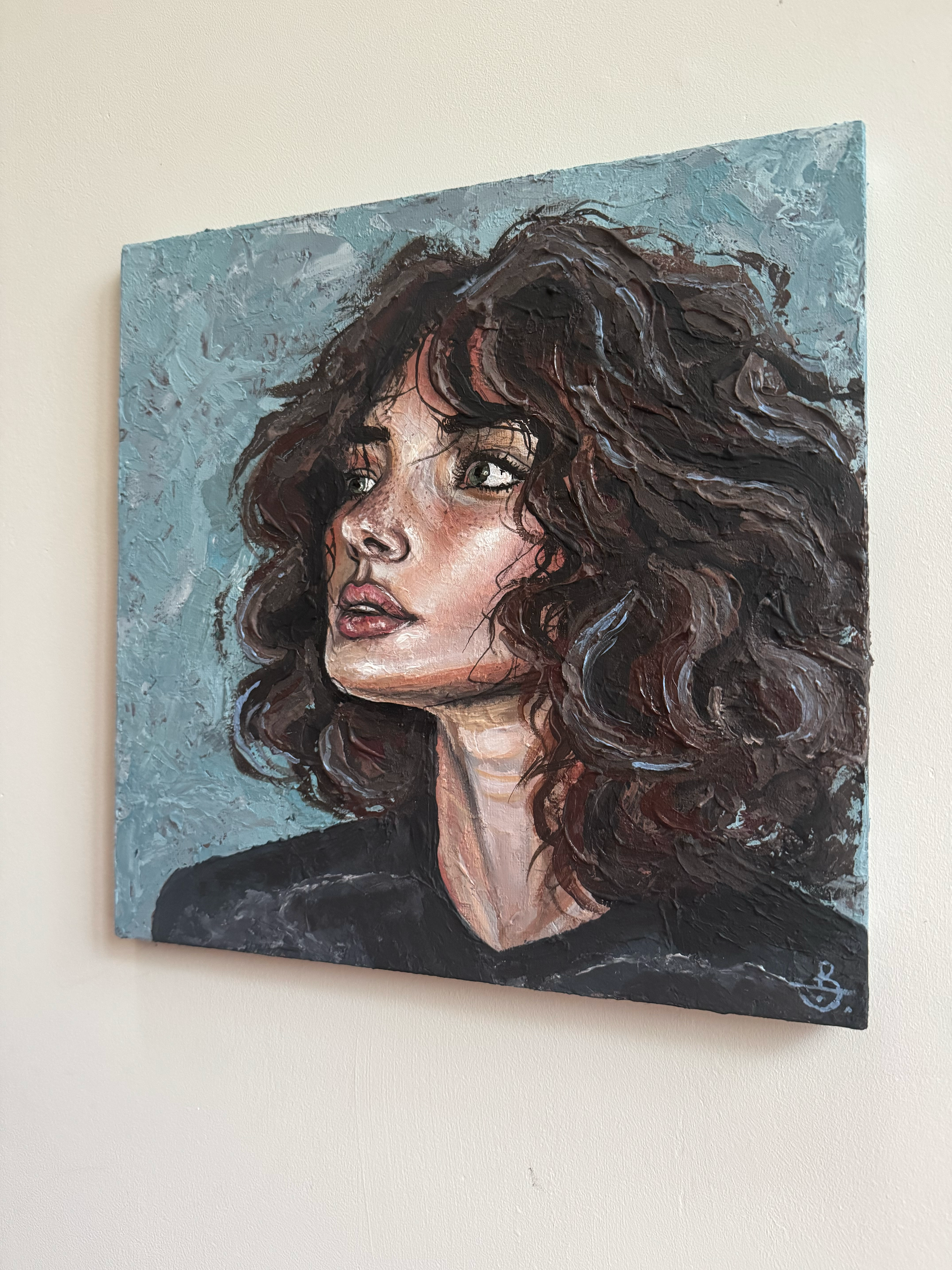A portrait study in acrylic and mixed media inclusions to create texture.